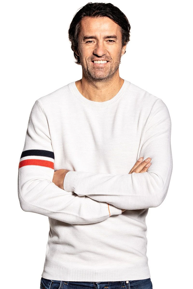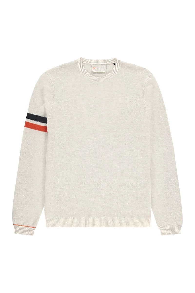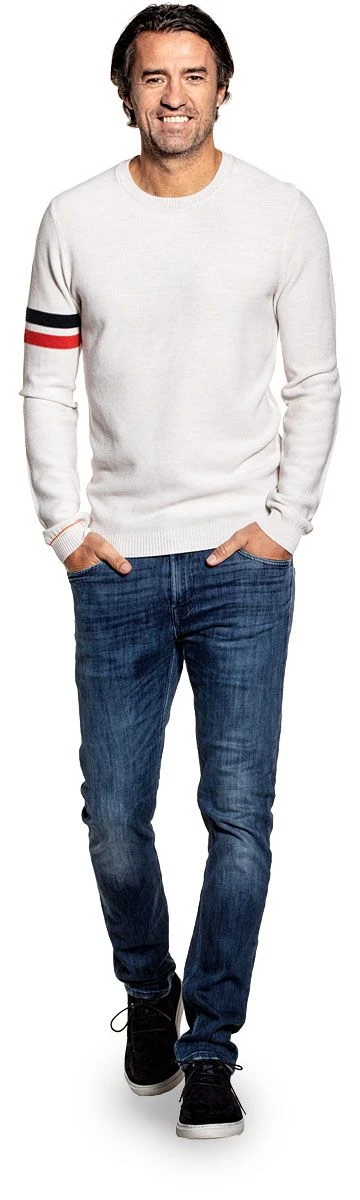 Deze Bee heeft als basis onze Wool White De strepen op de rechter bovenarm zijn in de kleuren True Navy en Burned mandarin.