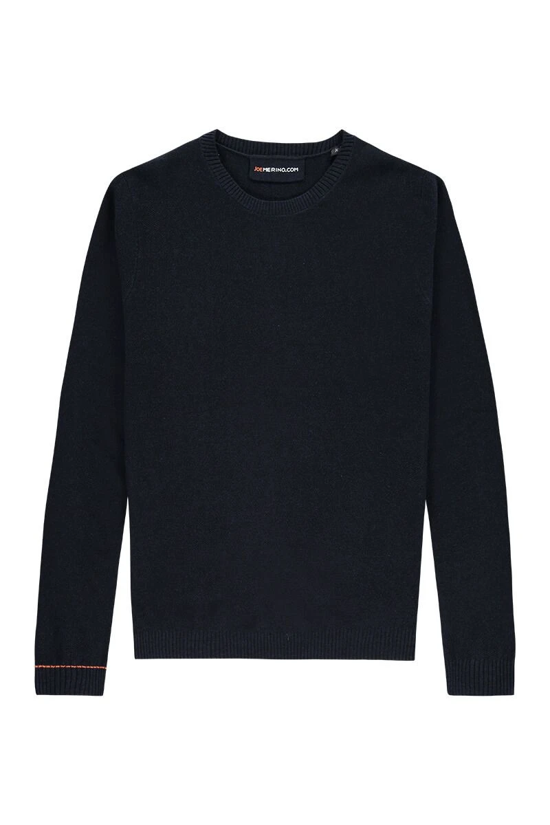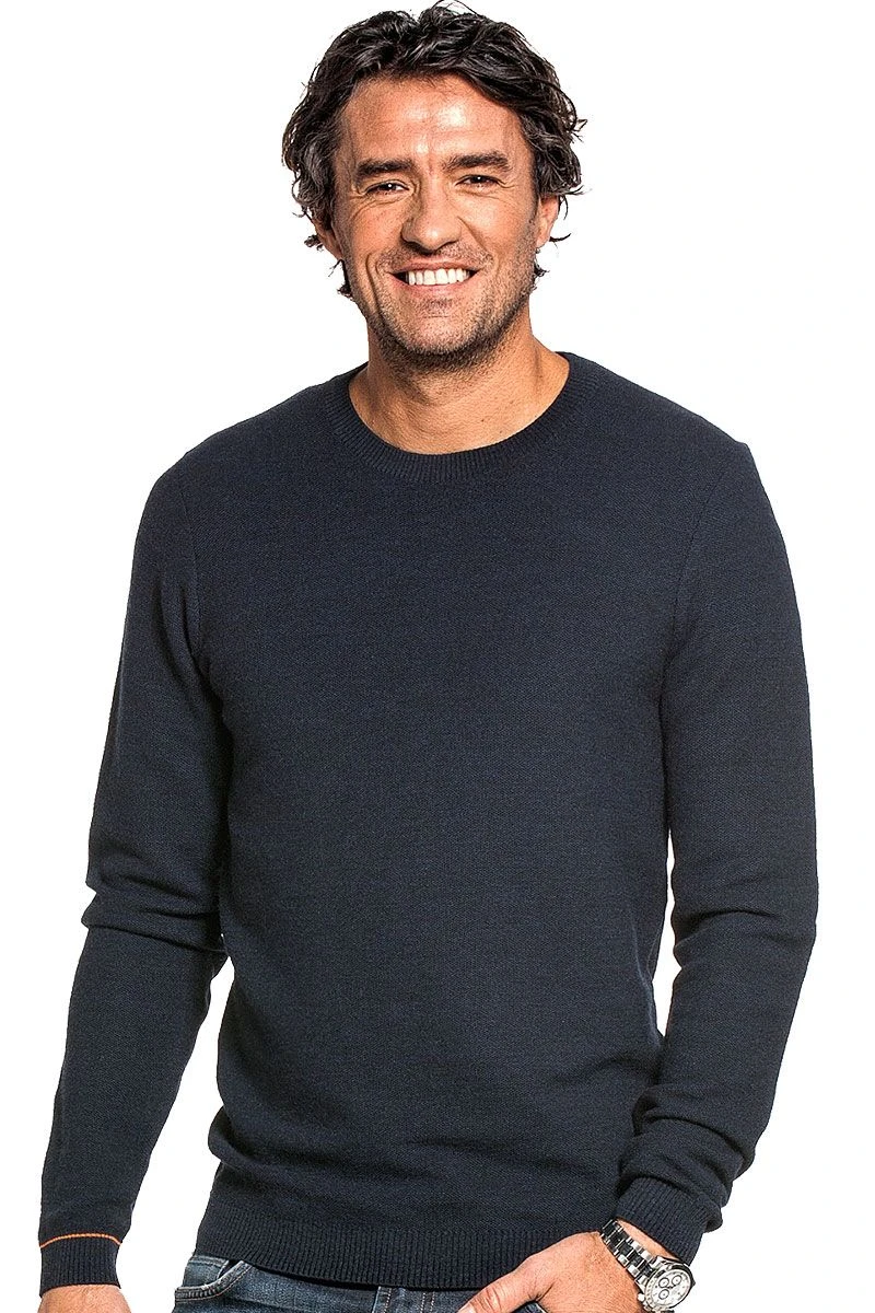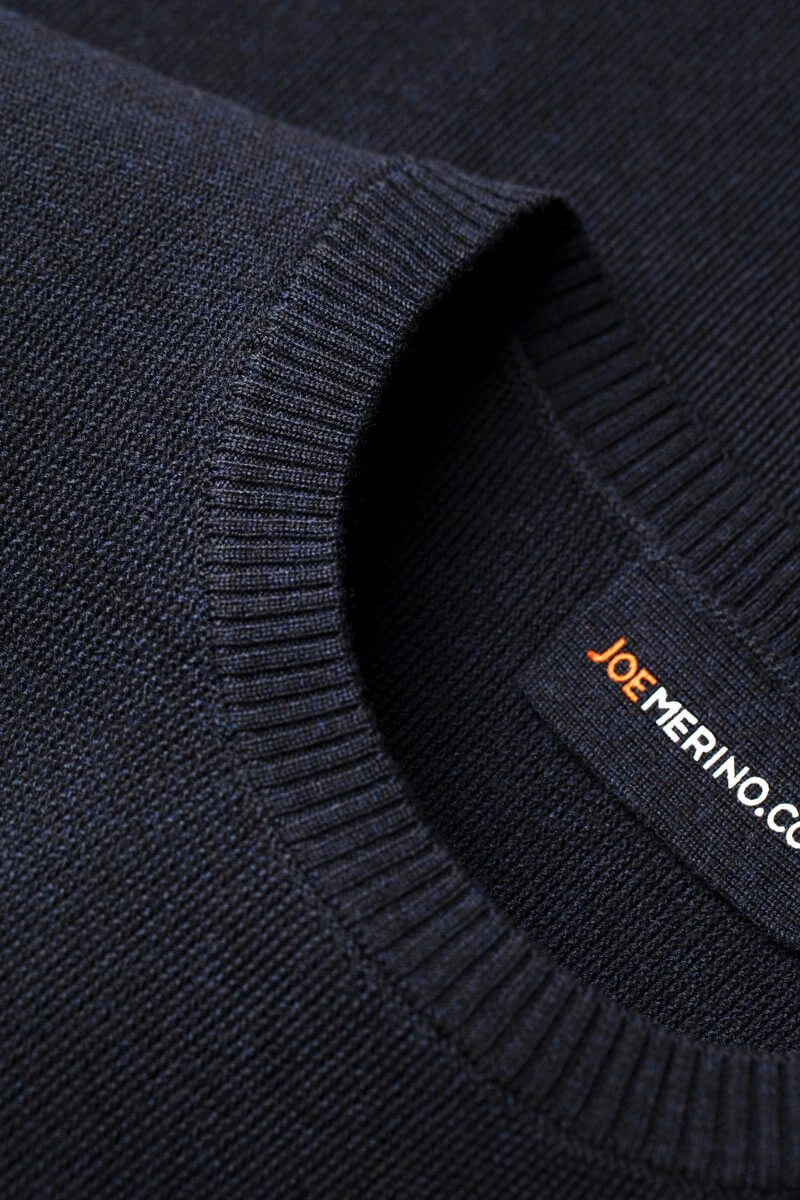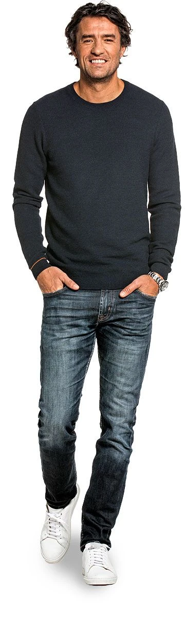 Mooi donkerblauw met onderliggende lichtblauwe en zwarte accenten. Daardoor heeft de trui een intens diepe kleur die nooit vaal wordt.