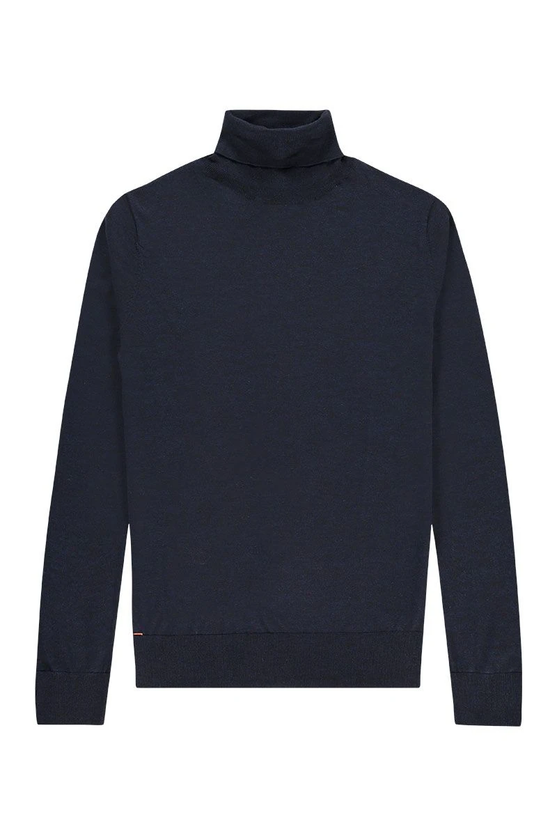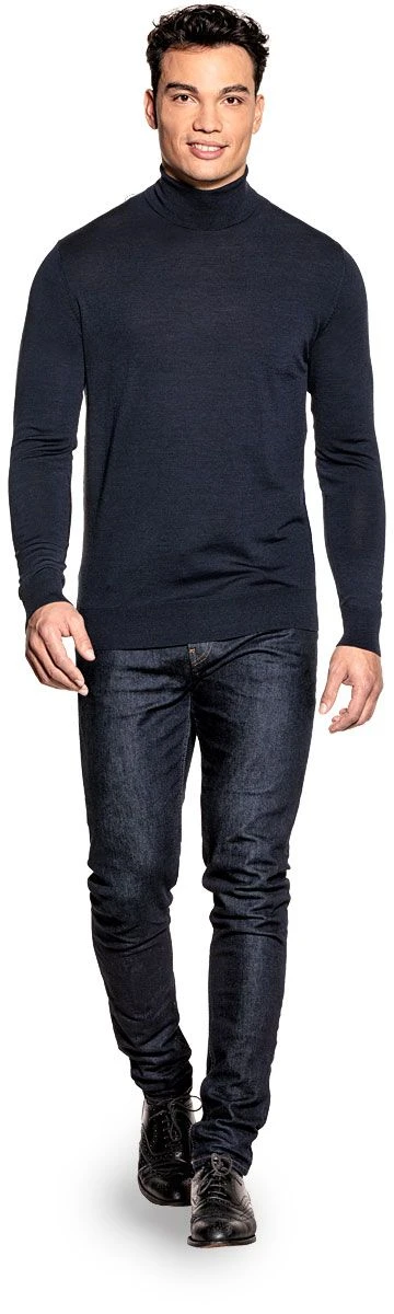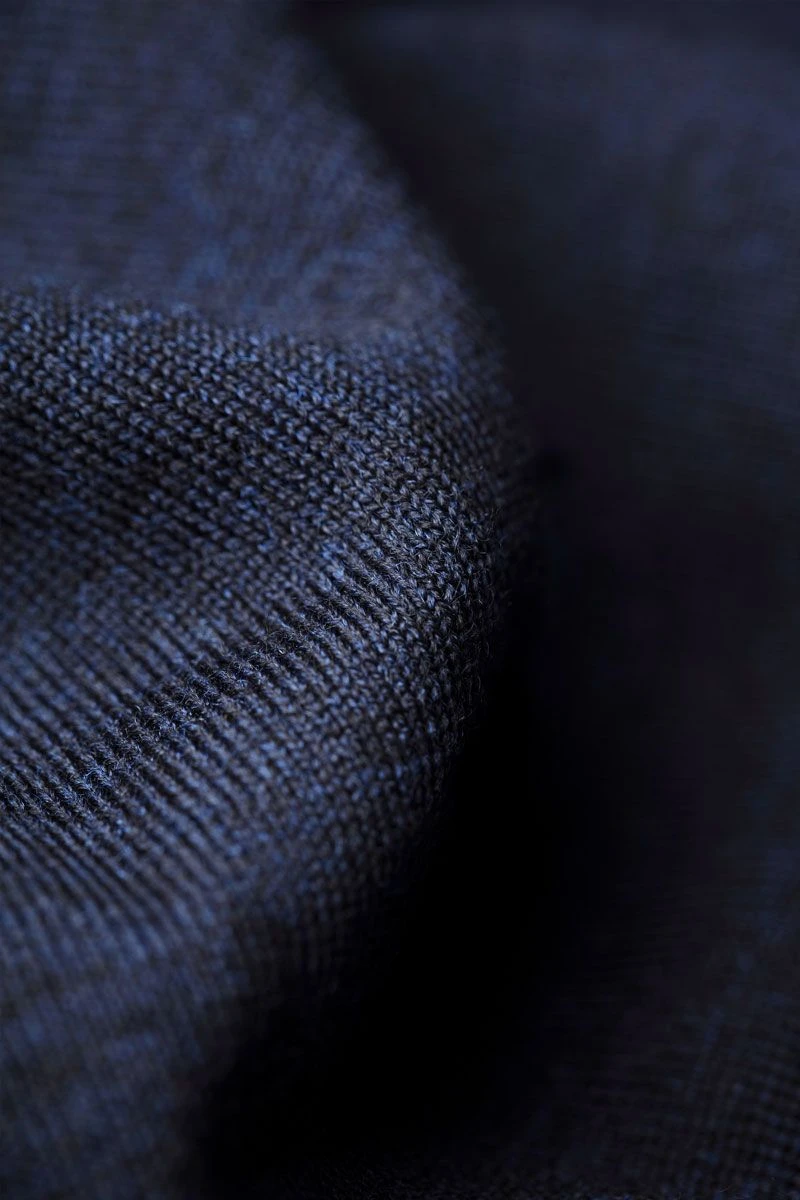 Mooi donkerblauw met onderliggende lichtblauwe en zwarte accenten. Daardoor heeft de trui een intens diepe kleur die nooit vaal wordt.