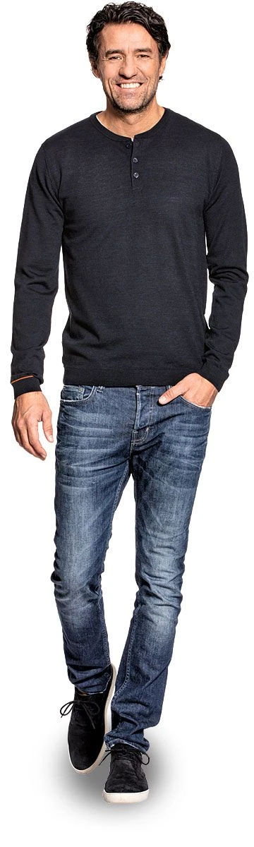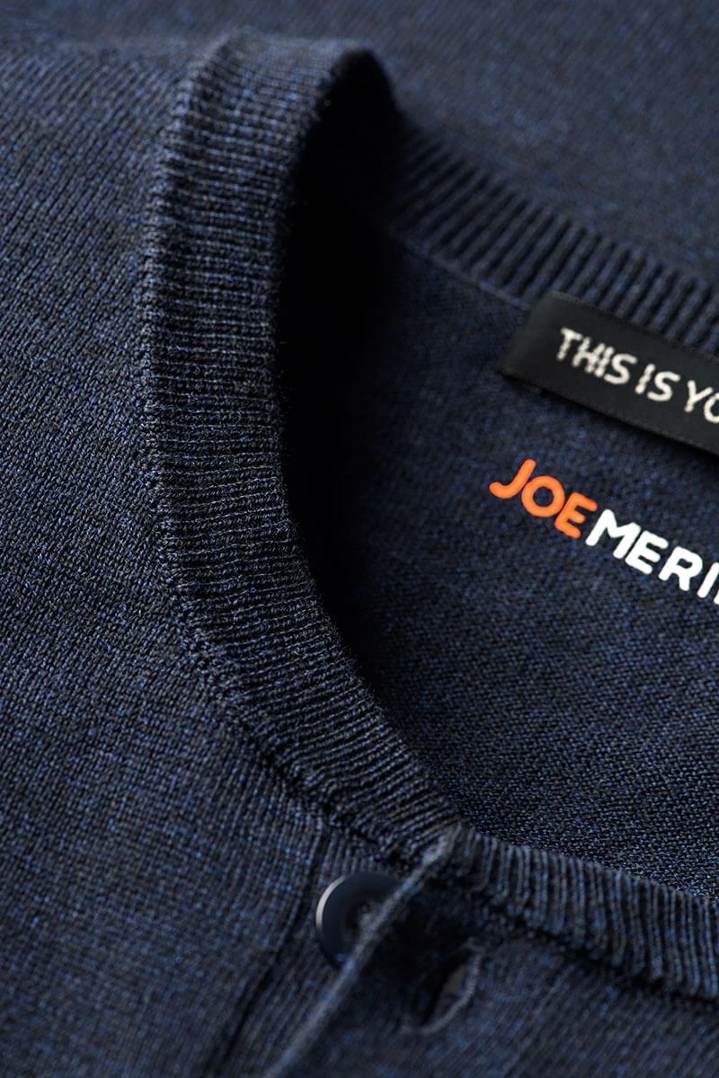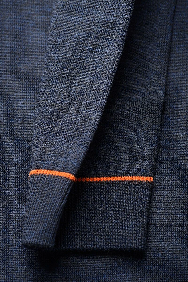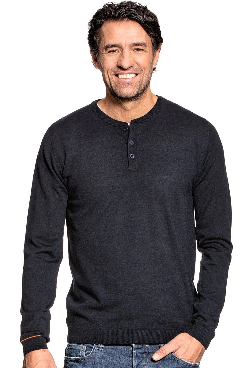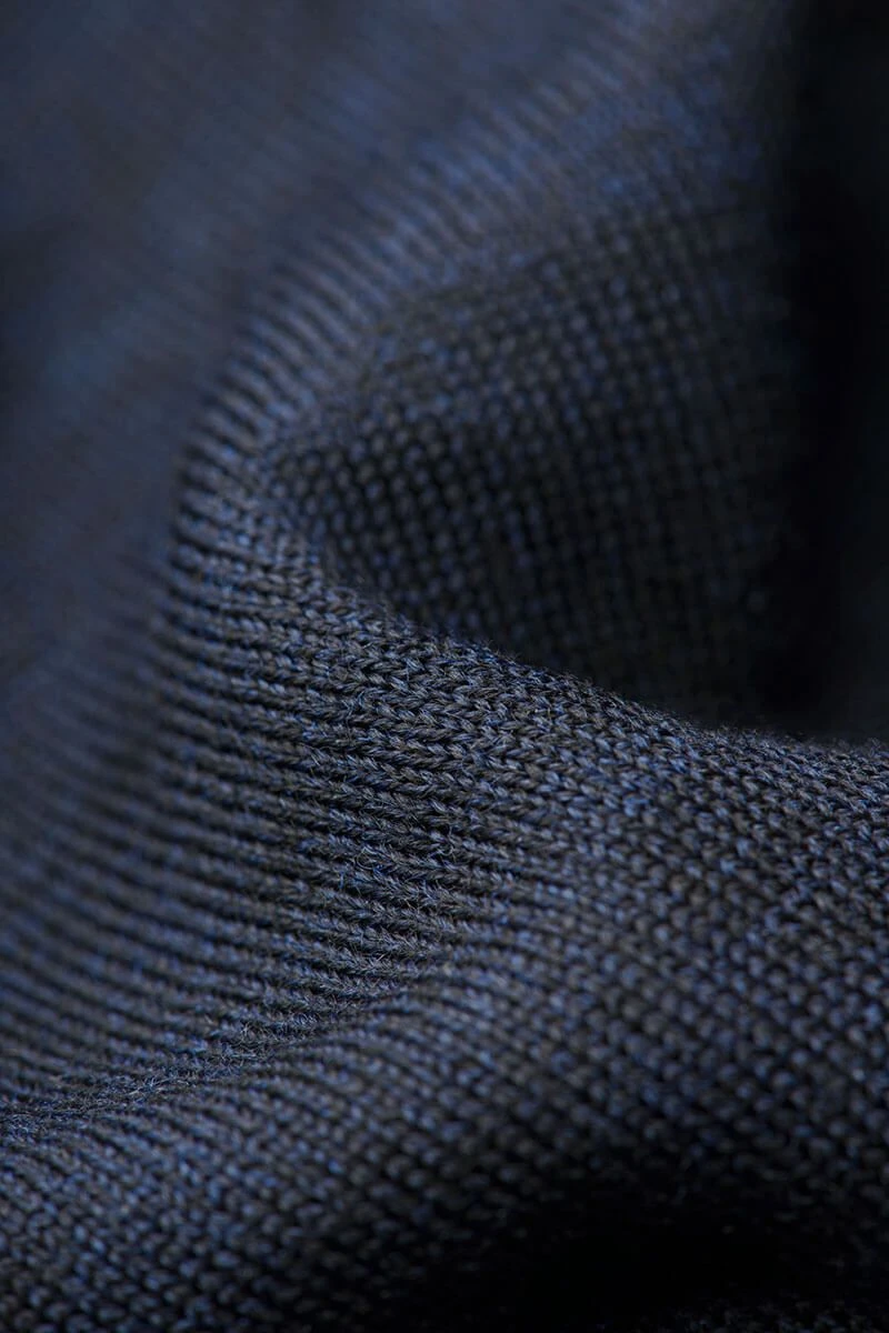 Mooi donkerblauw met onderliggende lichtblauwe en zwarte accenten. Daardoor heeft de trui een intens diepe kleur die nooit vaal wordt.