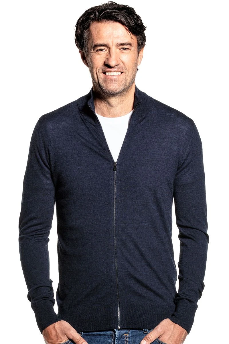Mooi donkerblauw met onderliggende lichtblauwe en zwarte accenten. Daardoor heeft de trui een intens diepe kleur die nooit vaal wordt.