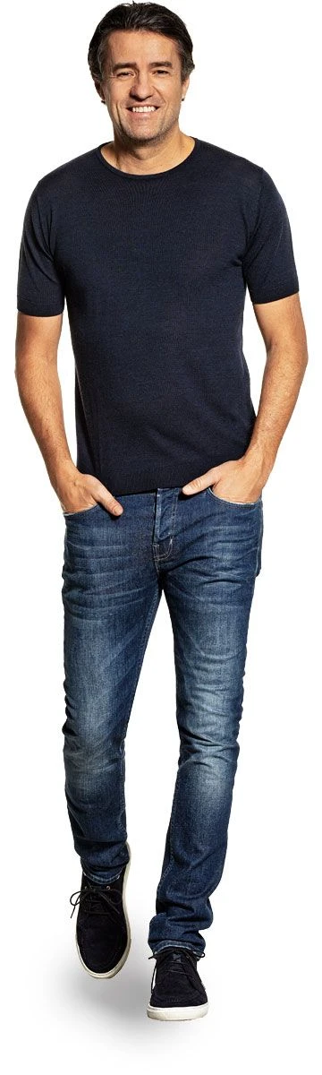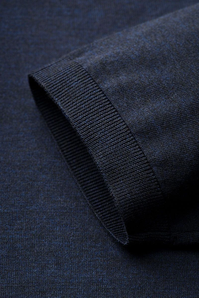 Mooi donkerblauw met onderliggende lichtblauwe en zwarte accenten. Daardoor heeft de trui een intens diepe kleur die nooit vaal wordt.