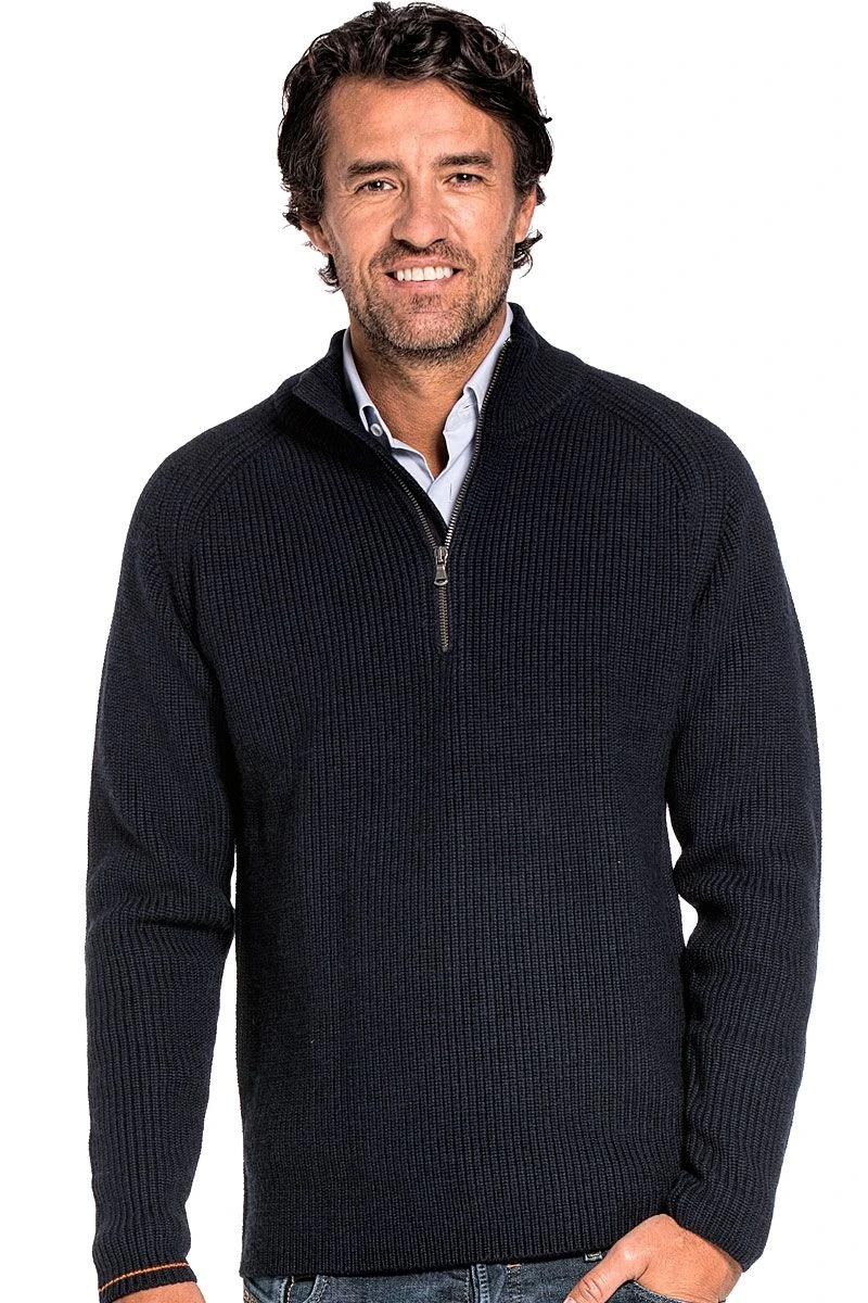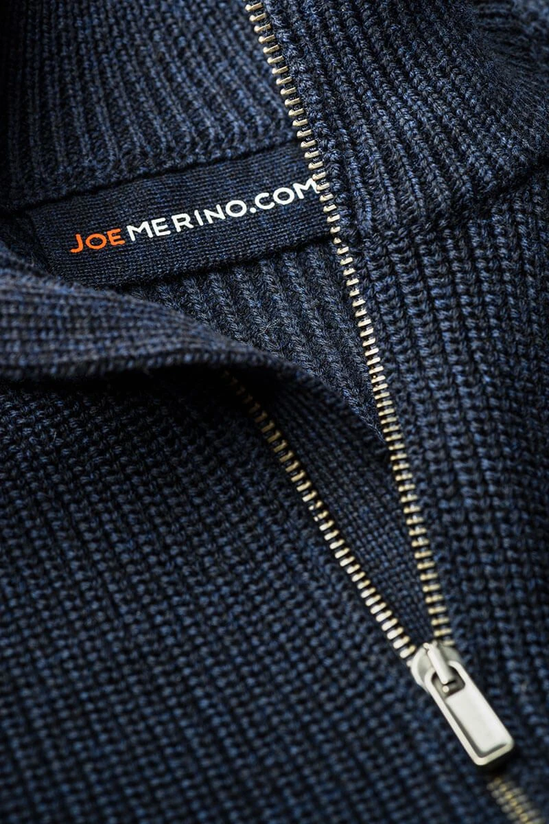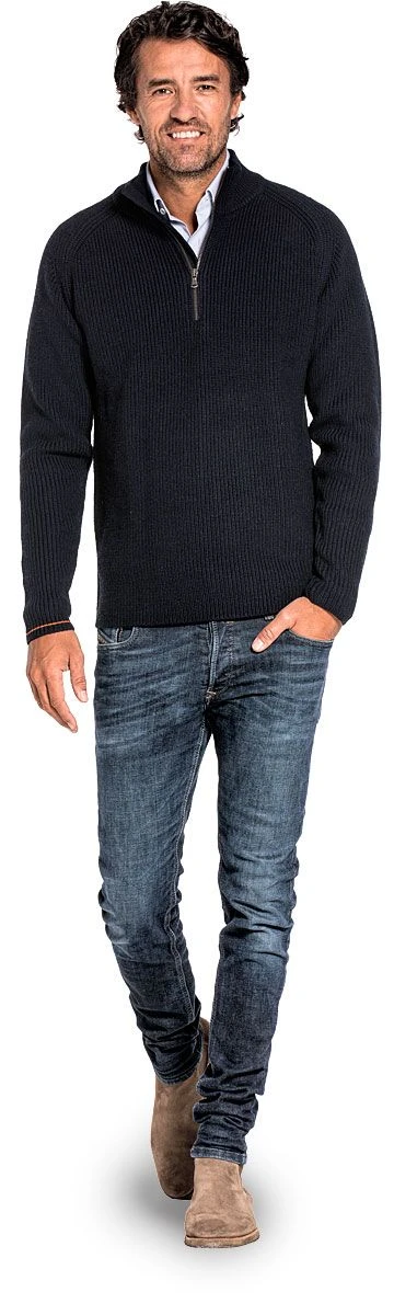 Mooi donkerblauw met onderliggende lichtblauwe en zwarte accenten. Daardoor heeft de trui een intens diepe kleur die nooit vaal wordt.