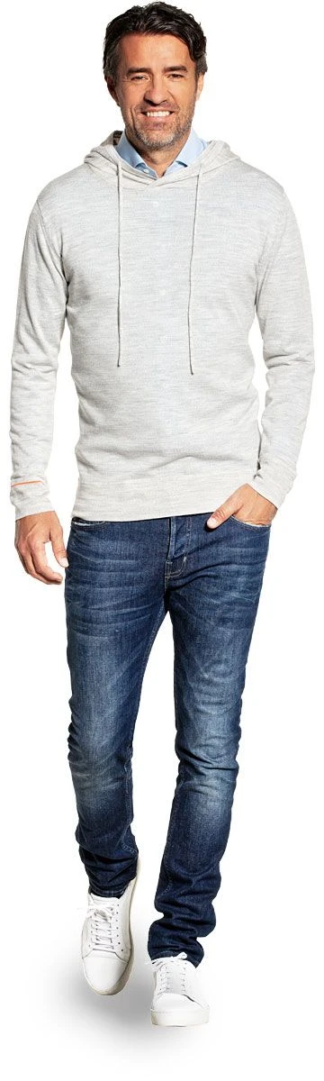Heldere frisse grijs met een mooie melange van grijstonen. Geïnspireerd op de indrukwekkende krijtrotsen aan de Engelse Zuidkust. Goed te combineren met een lichtblauw overhemd of een wit T-shirt.