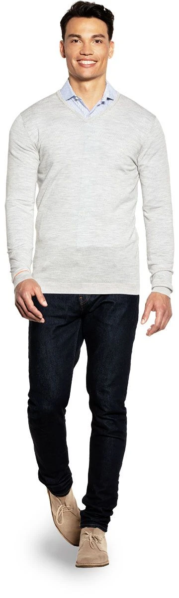 Heldere frisse grijs met een mooie melange van grijstonen. Geïnspireerd op de indrukwekkende krijtrotsen aan de Engelse Zuidkust. Goed te combineren met een lichtblauw overhemd of een wit T-shirt.