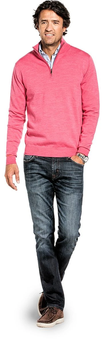 Felle kleur pink met onderliggende witte accenten. Hierdoor krijgt de trui een zachte uitstraling.
