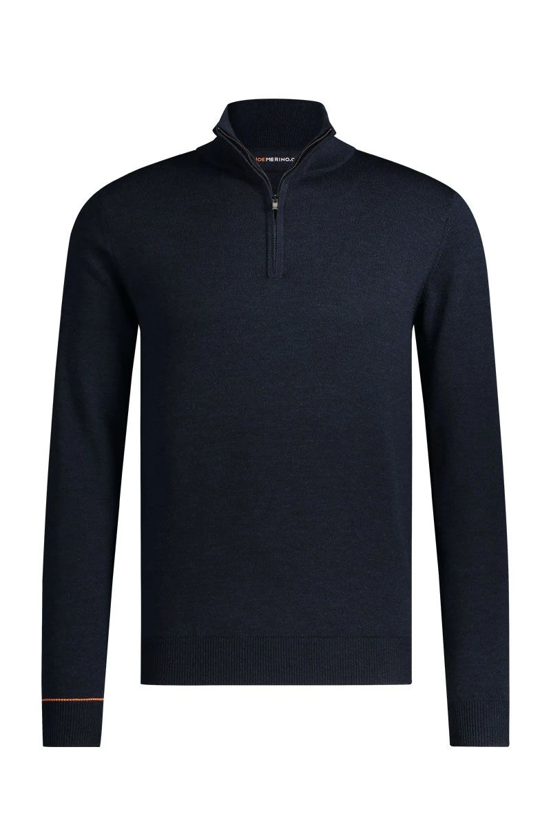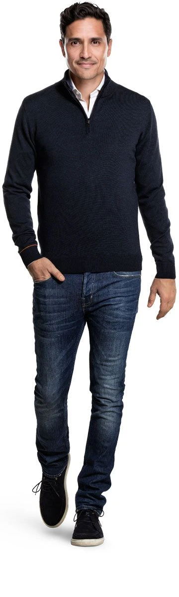 Mooi donkerblauw met onderliggende lichtblauwe en zwarte accenten. Daardoor heeft de trui een intens diepe kleur die nooit vaal wordt.