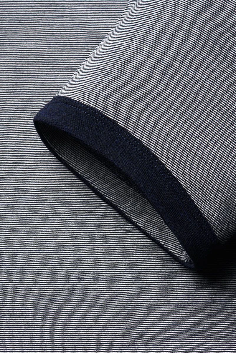 Subtiel streeppatroon van ‘true navy’ met ‘wool white’, met contrasterende boord en bies op de mouwen.